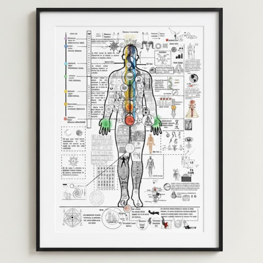 Conexión Cuerpo-Mente: Esquemas técnicos que analizan la complejidad del ser humano desde una perspectiva anatómica y mÃstica.