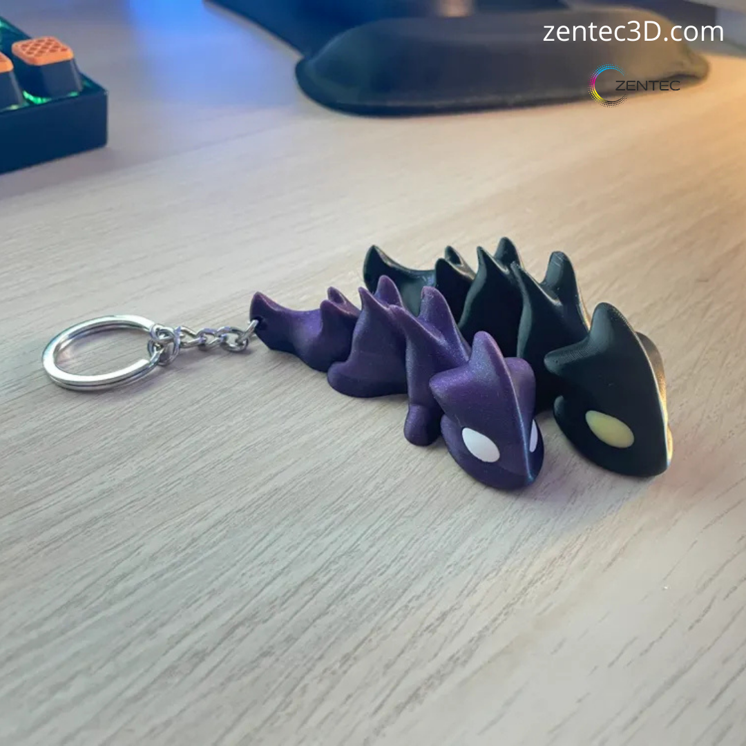 Este no es un llavero común. Hemos diseñado este pequeño guardián utilizando modelado 3D de aspecto realista [cite: 2025-11-28] para lograr un acabado detallado y profesional. Gracias al uso de filamento de coextrusión de alta calidad, el color fluye dinámicamente entre tonos lila y negro profundo según cómo le dé la luz.